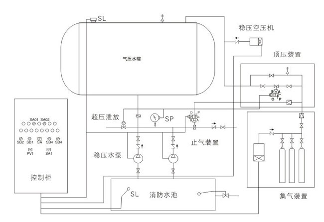 日常稳压泵工作时将水送至管网和气压水罐,当气压水罐内液位达到设定值上限时,补水泵停止工作。压力不足时补气系统工作,当压力升至稳压上限时,停止补气。通常系统漏水原因造成管网压力下降,由液位控制器控制稳压泵启动补水;系统气量缺失由压力控制器控制补气系统(空气压缩机)启停补气;这样气压水罐日常能做到气液平衡,压力与液位互锁。当发生火情时,消防信号输入,气体顶压系统工作将动力气源减压释放,均匀充入气压水罐里将水顶入消防管网,向管网提供不少于10min的消防用水。