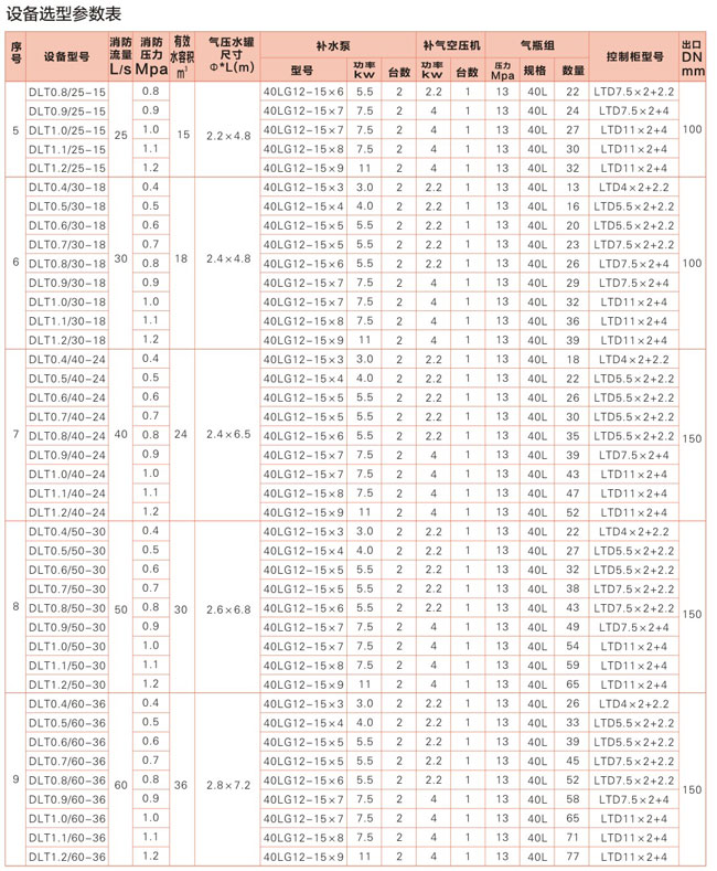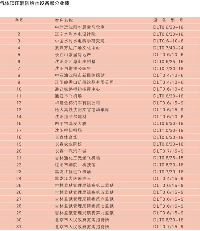 建筑物消防供水系统中通常用气压水罐来代替高位水箱,来满足10分钟消防初期用水量,但往往选用普通气压水罐要占据较大空间,我公司生产的DLT系列气体顶压消防给水设备是以GB27898-2011标准为依据生产的新型固定灭火装置。该装置的气压水罐容积是普通气压水罐的1/3~1/5,节省占地面积、供水压力平稳,是理想的大型应急消防气压给水设备。