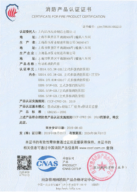 多级泵消防认证证书-电动机消防泵组